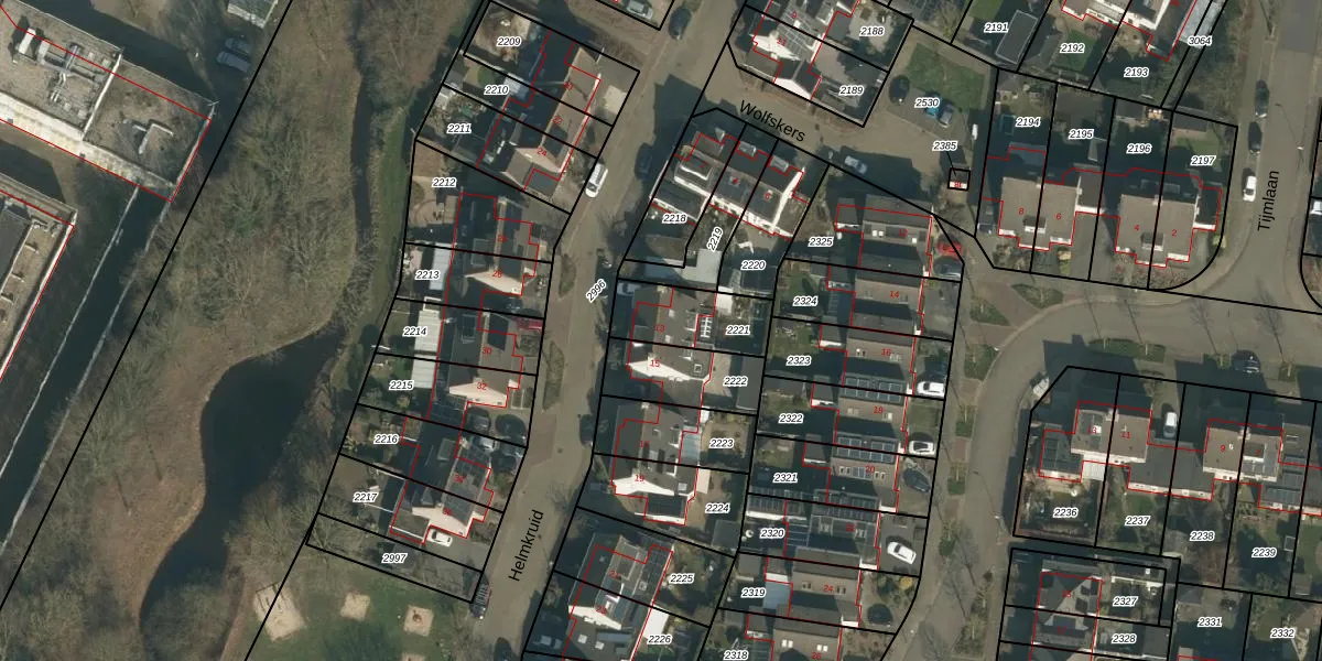 Het perceel waarop Helmkruid 13 staat heeft een oppervlakte van 213 m². Dit is een middelgroot perceel. De perceeloppervlakte wordt geregistreerd door het Kadaster. Gedetailleerde informatie over de maten van dit perceel kunt u vinden in het rapport Kadastrale kaart met maatvoering van Helmkruid 13.