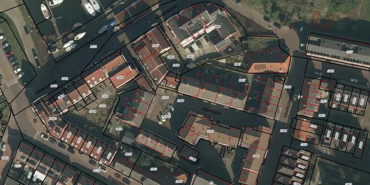 Het perceel waarop Infirmerie 22 staat heeft een oppervlakte van 1092 m². Dit is een zeer groot perceel. De perceeloppervlakte wordt geregistreerd door het Kadaster. Gedetailleerde informatie over de maten van dit perceel kunt u vinden in het rapport Kadastrale kaart met maatvoering van Infirmerie 22.