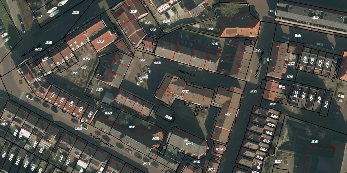 Het perceel waarop Infirmerie 43 staat heeft een oppervlakte van 395 m². Dit is een groot perceel. De perceeloppervlakte wordt geregistreerd door het Kadaster. Gedetailleerde informatie over de maten van dit perceel kunt u vinden in het rapport Kadastrale kaart met maatvoering van Infirmerie 43.