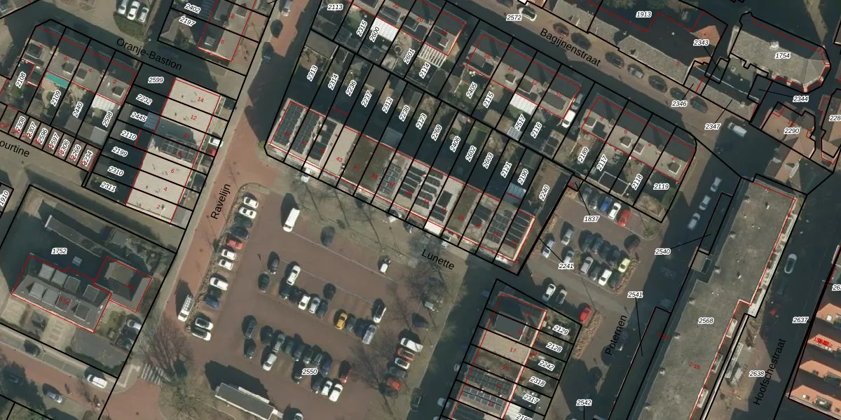 Het perceel waarop Lunette 33 staat heeft een oppervlakte van 135 m². Dit is een middelgroot perceel. De perceeloppervlakte wordt geregistreerd door het Kadaster. Gedetailleerde informatie over de maten van dit perceel kunt u vinden in het rapport Kadastrale kaart met maatvoering van Lunette 33.