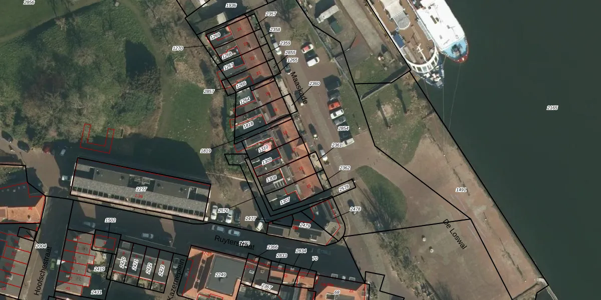 Het perceel waarop Maaskade 17 staat heeft een oppervlakte van 121 m². Dit is een middelgroot perceel. De perceeloppervlakte wordt geregistreerd door het Kadaster. Gedetailleerde informatie over de maten van dit perceel kunt u vinden in het rapport Kadastrale kaart met maatvoering van Maaskade 17.