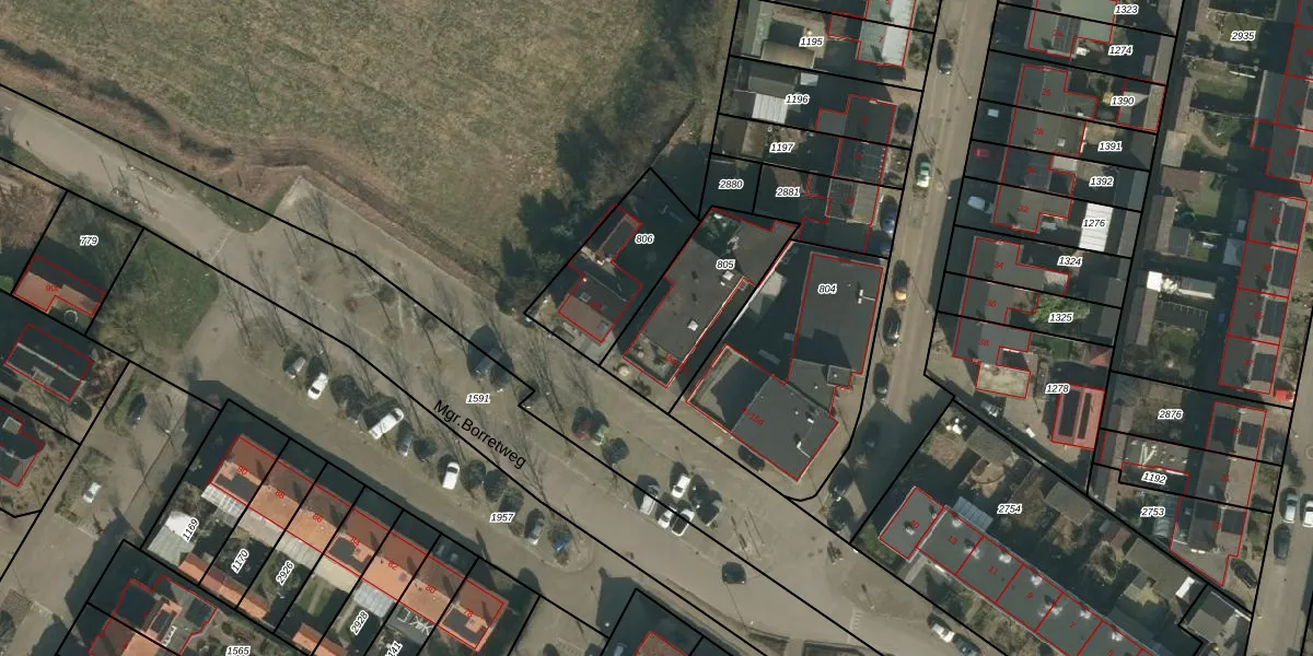 Het perceel waarop Mgr.Borretweg 17-b staat heeft een oppervlakte van 415 m². Dit is een groot perceel. De perceeloppervlakte wordt geregistreerd door het Kadaster. Gedetailleerde informatie over de maten van dit perceel kunt u vinden in het rapport Kadastrale kaart met maatvoering van Mgr.Borretweg 17-b.