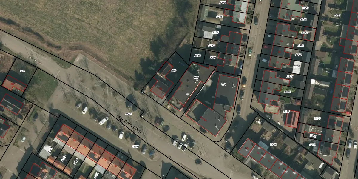 Het perceel waarop Mgr.Borretweg 17-c staat heeft een oppervlakte van 415 m². Dit is een groot perceel. De perceeloppervlakte wordt geregistreerd door het Kadaster. Gedetailleerde informatie over de maten van dit perceel kunt u vinden in het rapport Kadastrale kaart met maatvoering van Mgr.Borretweg 17-c.