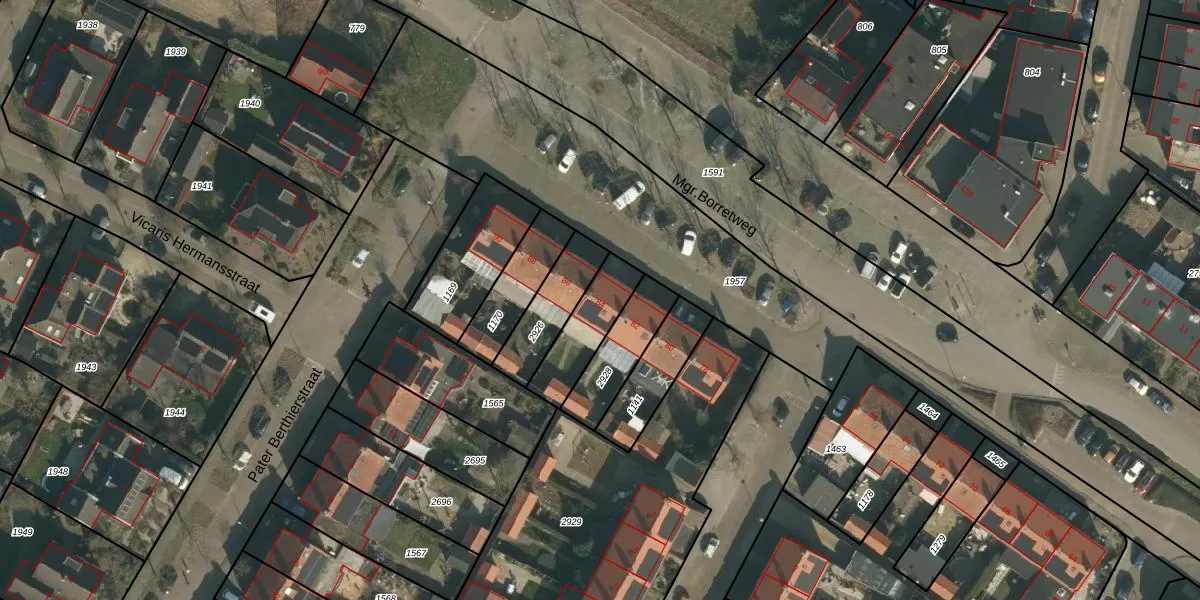 Het perceel waarop Mgr.Borretweg 84 staat heeft een oppervlakte van 1724 m². Dit is een zeer groot perceel. De perceeloppervlakte wordt geregistreerd door het Kadaster. Gedetailleerde informatie over de maten van dit perceel kunt u vinden in het rapport Kadastrale kaart met maatvoering van Mgr.Borretweg 84.