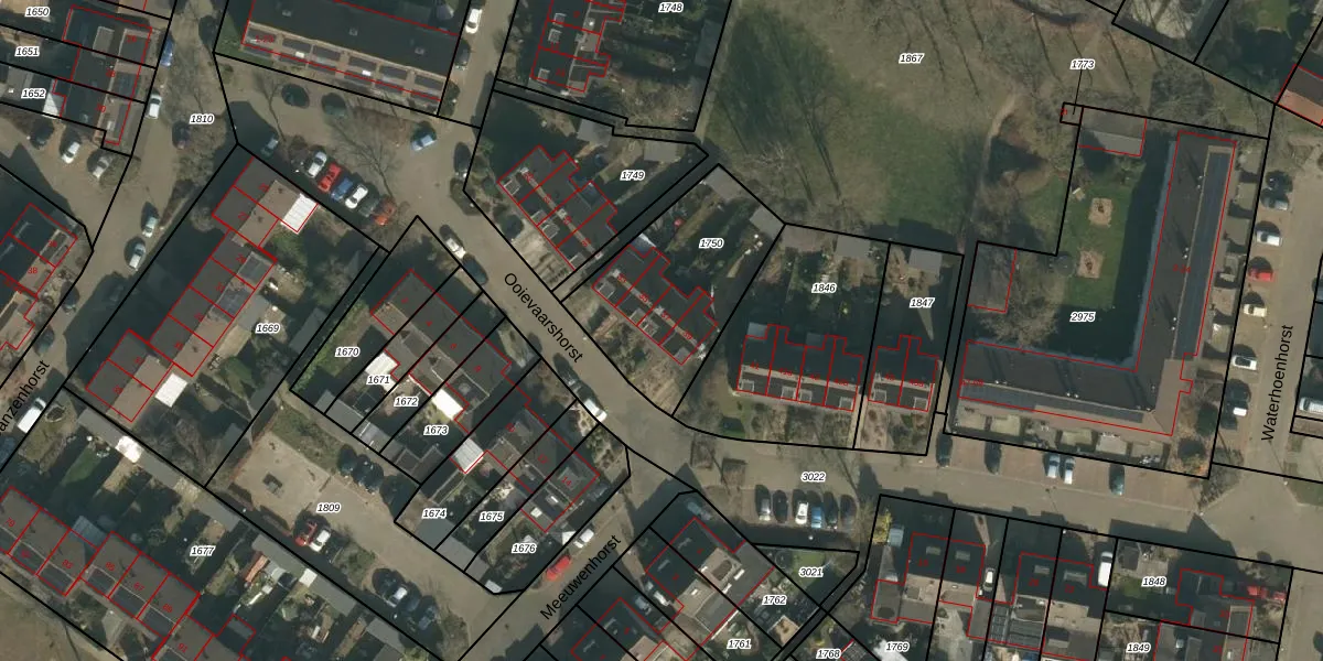 Het perceel waarop Ooievaarshorst 37 staat heeft een oppervlakte van 616 m². Dit is een groot perceel. De perceeloppervlakte wordt geregistreerd door het Kadaster. Gedetailleerde informatie over de maten van dit perceel kunt u vinden in het rapport Kadastrale kaart met maatvoering van Ooievaarshorst 37.