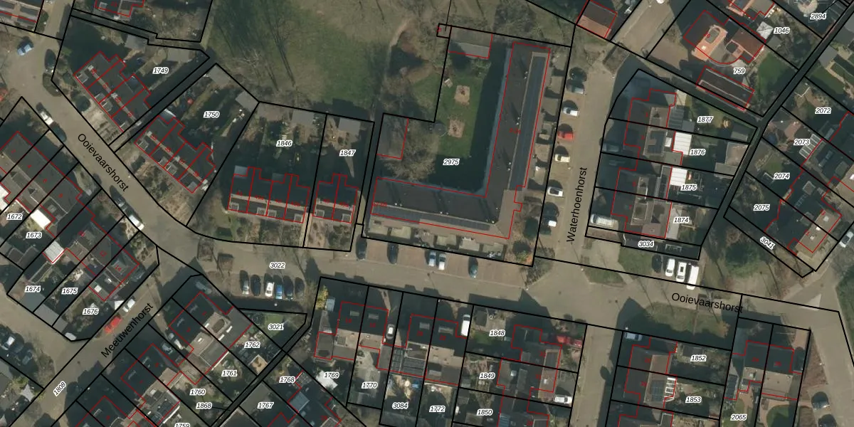 Het perceel waarop Ooievaarshorst 55 staat heeft een oppervlakte van 1851 m². Dit is een zeer groot perceel. De perceeloppervlakte wordt geregistreerd door het Kadaster. Gedetailleerde informatie over de maten van dit perceel kunt u vinden in het rapport Kadastrale kaart met maatvoering van Ooievaarshorst 55.