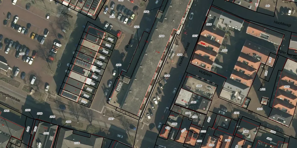 Het perceel waarop Poternen 33 staat heeft een oppervlakte van 1698 m². Dit is een zeer groot perceel. De perceeloppervlakte wordt geregistreerd door het Kadaster. Gedetailleerde informatie over de maten van dit perceel kunt u vinden in het rapport Kadastrale kaart met maatvoering van Poternen 33.