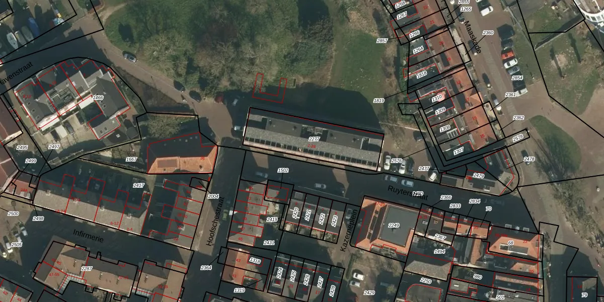 Ruyterstraat 14 is gelegen op kadastraal perceel GVE00B2277. Deze kadastrale aanduiding is uniek en wordt gebruikt door het Kadaster om eigendomsrechten en andere zakelijke rechten vast te leggen. Het perceel maakt onderdeel uit van de kadastrale gemeente Grave.