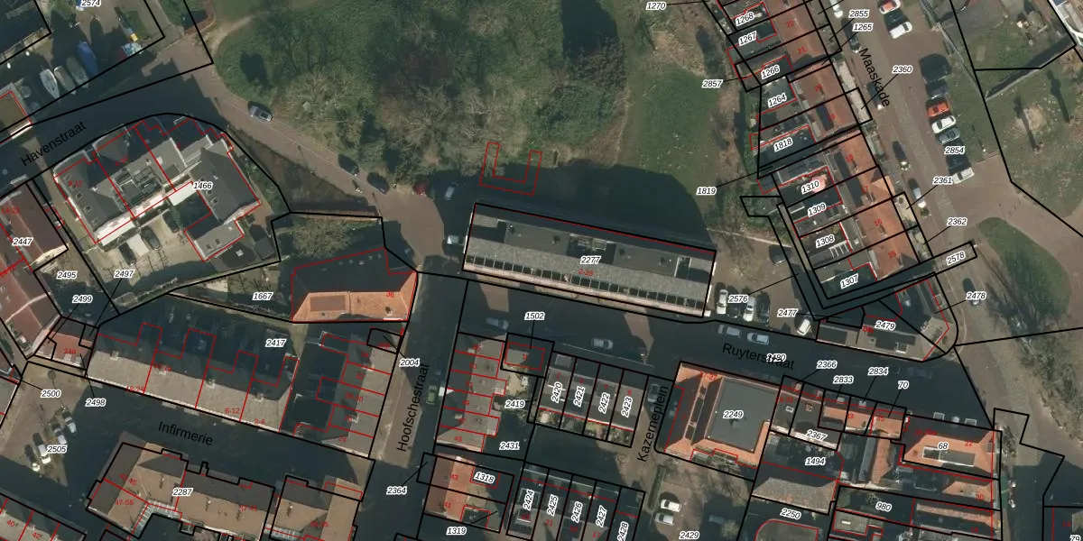 Ruyterstraat 2 is gelegen op kadastraal perceel GVE00B2277. Deze kadastrale aanduiding is uniek en wordt gebruikt door het Kadaster om eigendomsrechten en andere zakelijke rechten vast te leggen. Het perceel maakt onderdeel uit van de kadastrale gemeente Grave.