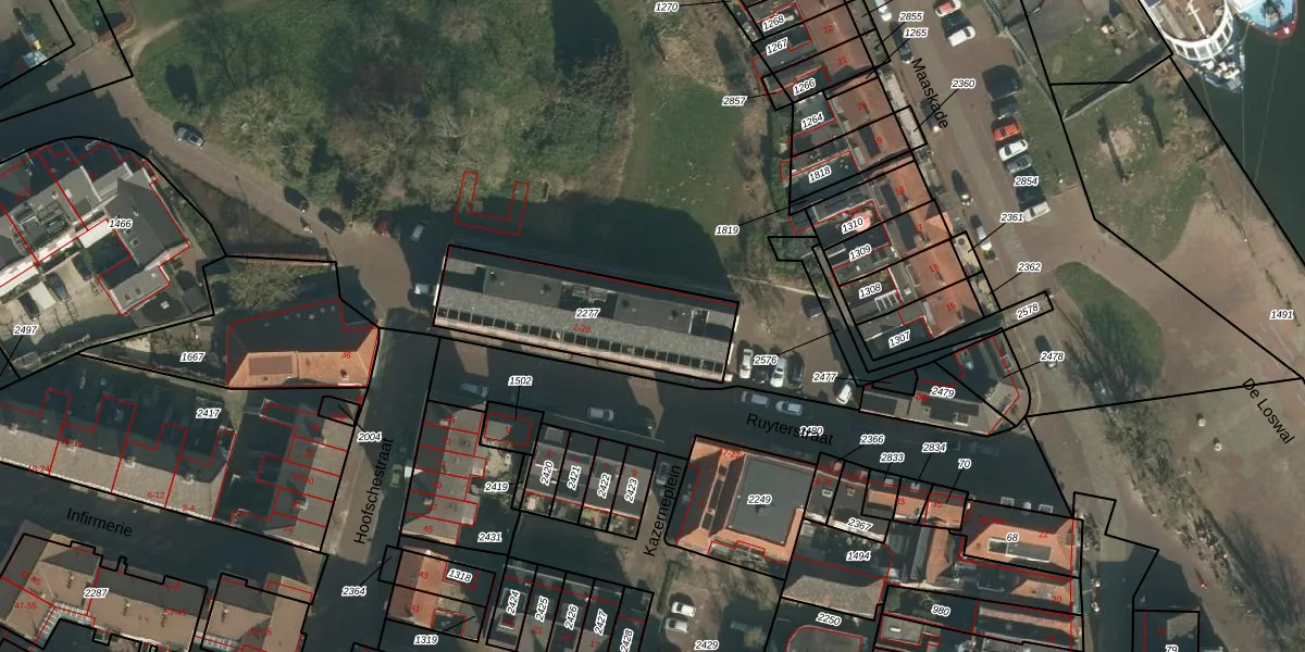 Ruyterstraat 24 is gelegen op kadastraal perceel GVE00B2277. Deze kadastrale aanduiding is uniek en wordt gebruikt door het Kadaster om eigendomsrechten en andere zakelijke rechten vast te leggen. Het perceel maakt onderdeel uit van de kadastrale gemeente Grave.