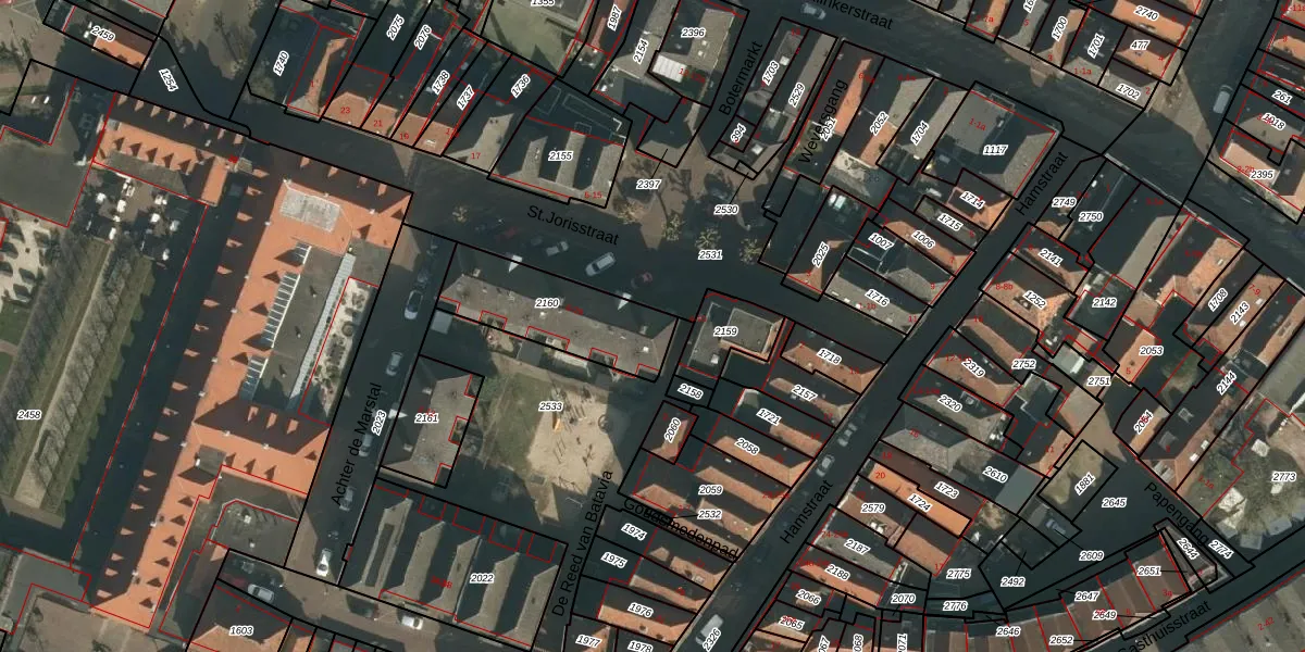 Het perceel waarop St.Jorisstraat 6 staat heeft een oppervlakte van 380 m². Dit is een groot perceel. De perceeloppervlakte wordt geregistreerd door het Kadaster. Gedetailleerde informatie over de maten van dit perceel kunt u vinden in het rapport Kadastrale kaart met maatvoering van St.Jorisstraat 6.