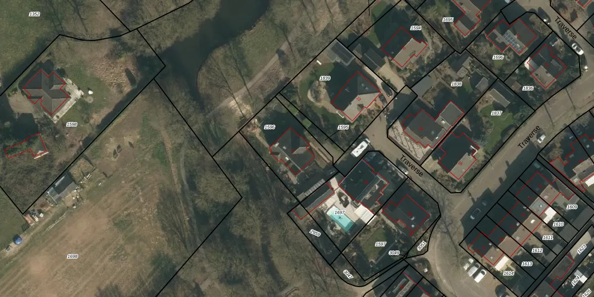 Het perceel waarop Traverse 24 staat heeft een oppervlakte van 567 m². Dit is een groot perceel. De perceeloppervlakte wordt geregistreerd door het Kadaster. Gedetailleerde informatie over de maten van dit perceel kunt u vinden in het rapport Kadastrale kaart met maatvoering van Traverse 24.