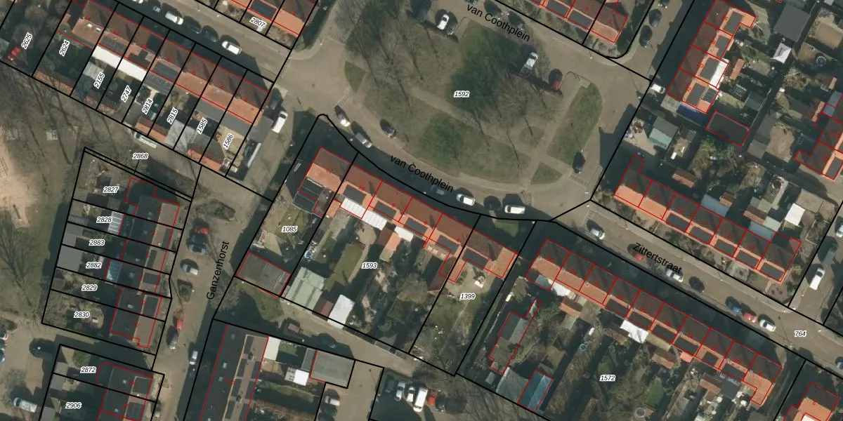 Het perceel waarop van Coothplein 6 staat heeft een oppervlakte van 1215 m². Dit is een zeer groot perceel. De perceeloppervlakte wordt geregistreerd door het Kadaster. Gedetailleerde informatie over de maten van dit perceel kunt u vinden in het rapport Kadastrale kaart met maatvoering van van Coothplein 6.