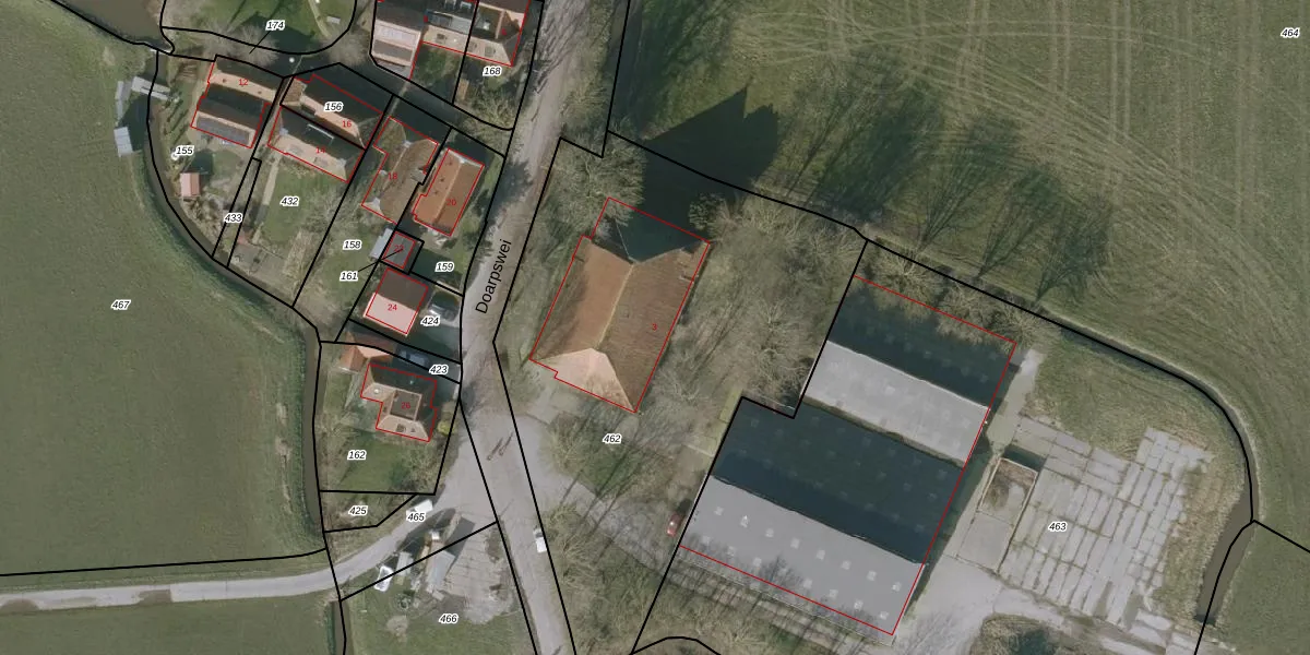 Doarpswei 3 is gelegen op kadastraal perceel NLD01H462. Deze kadastrale aanduiding is uniek en wordt gebruikt door het Kadaster om eigendomsrechten en andere zakelijke rechten vast te leggen. Het perceel maakt onderdeel uit van de kadastrale gemeente Nieuwland Friesland.