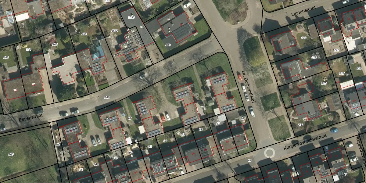 Het perceel waarop Essenstraat 1 staat heeft een oppervlakte van 2695 m². Dit is een zeer groot perceel. De perceeloppervlakte wordt geregistreerd door het Kadaster. Gedetailleerde informatie over de maten van dit perceel kunt u vinden in het rapport Kadastrale kaart met maatvoering van Essenstraat 1.