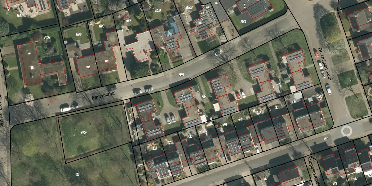 Het perceel waarop Essenstraat 9 staat heeft een oppervlakte van 2695 m². Dit is een zeer groot perceel. De perceeloppervlakte wordt geregistreerd door het Kadaster. Gedetailleerde informatie over de maten van dit perceel kunt u vinden in het rapport Kadastrale kaart met maatvoering van Essenstraat 9.
