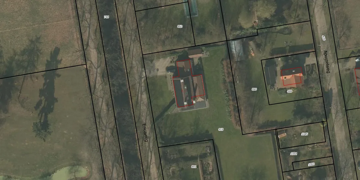 Het perceel waarop Ericaweg 2 staat heeft een oppervlakte van 4345 m². Dit is een zeer groot perceel. De perceeloppervlakte wordt geregistreerd door het Kadaster. Gedetailleerde informatie over de maten van dit perceel kunt u vinden in het rapport Kadastrale kaart met maatvoering van Ericaweg 2.