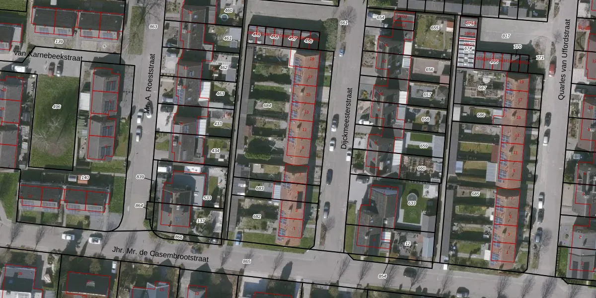 Het perceel waarop Dijckmeesterstraat 9 staat heeft een oppervlakte van 1332 m². Dit is een zeer groot perceel. De perceeloppervlakte wordt geregistreerd door het Kadaster. Gedetailleerde informatie over de maten van dit perceel kunt u vinden in het rapport Kadastrale kaart met maatvoering van Dijckmeesterstraat 9.