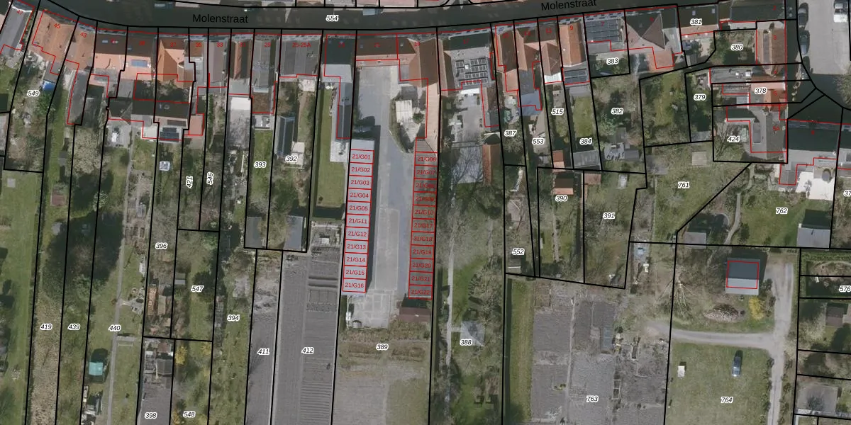 Molenstraat 21-G10 is gelegen op kadastraal perceel OBG00EG389. Deze kadastrale aanduiding is uniek en wordt gebruikt door het Kadaster om eigendomsrechten en andere zakelijke rechten vast te leggen. Het perceel maakt onderdeel uit van de kadastrale gemeente Oostburg.