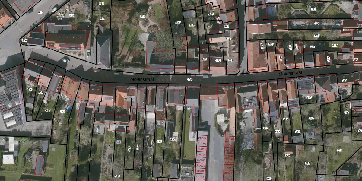 Molenstraat 25 is gelegen op kadastraal perceel OBG00EG392. Deze kadastrale aanduiding is uniek en wordt gebruikt door het Kadaster om eigendomsrechten en andere zakelijke rechten vast te leggen. Het perceel maakt onderdeel uit van de kadastrale gemeente Oostburg.