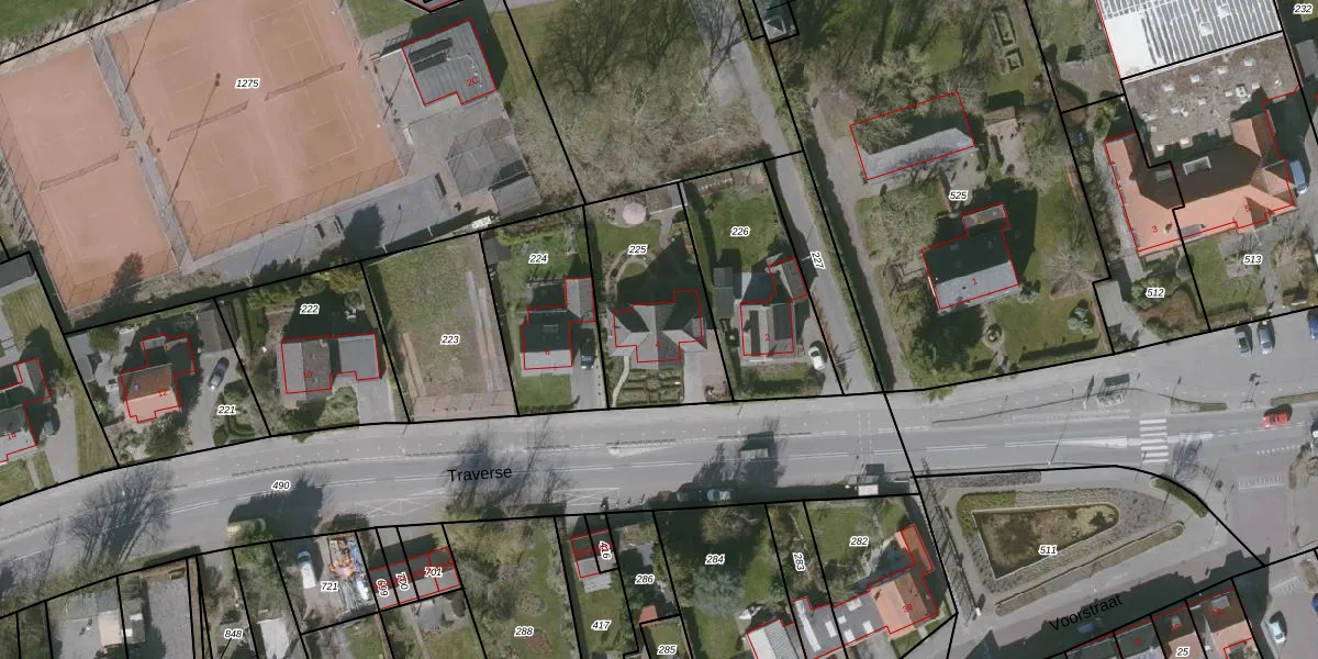 Het perceel waarop Traverse 4 staat heeft een oppervlakte van 537 m². Dit is een groot perceel. De perceeloppervlakte wordt geregistreerd door het Kadaster. Gedetailleerde informatie over de maten van dit perceel kunt u vinden in het rapport Kadastrale kaart met maatvoering van Traverse 4.