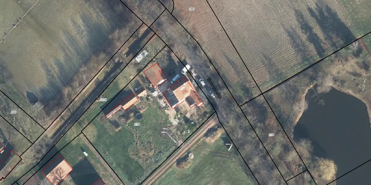 Het perceel waarop Boerijendijk 4 staat heeft een oppervlakte van 2835 m². Dit is een zeer groot perceel. De perceeloppervlakte wordt geregistreerd door het Kadaster. Gedetailleerde informatie over de maten van dit perceel kunt u vinden in het rapport Kadastrale kaart met maatvoering van Boerijendijk 4.