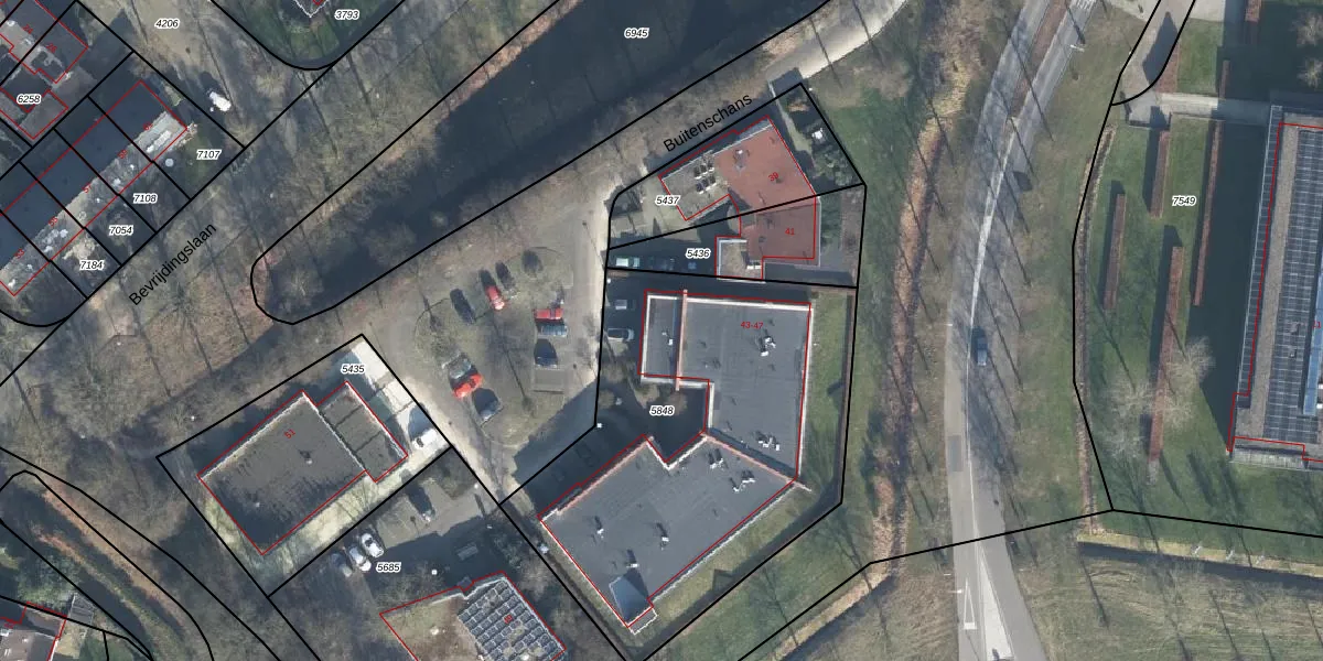 Het perceel waarop Buitenschans 43-a staat heeft een oppervlakte van 2023 m². Dit is een zeer groot perceel. De perceeloppervlakte wordt geregistreerd door het Kadaster. Gedetailleerde informatie over de maten van dit perceel kunt u vinden in het rapport Kadastrale kaart met maatvoering van Buitenschans 43-a.