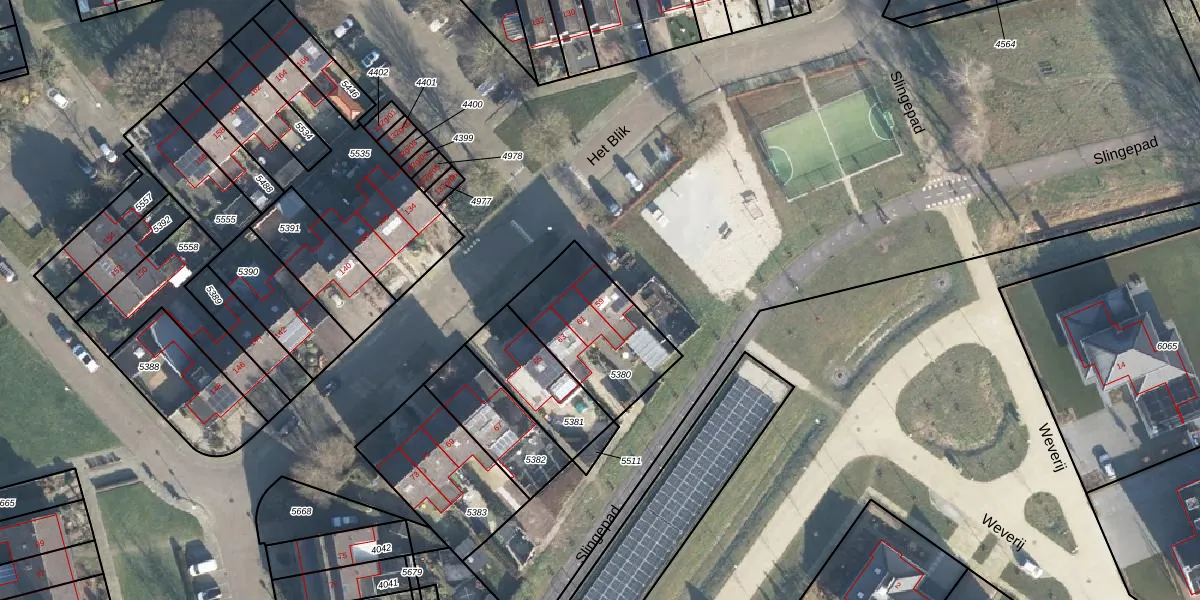 Het perceel waarop Het Blik 59 staat heeft een oppervlakte van 412 m². Dit is een groot perceel. De perceeloppervlakte wordt geregistreerd door het Kadaster. Gedetailleerde informatie over de maten van dit perceel kunt u vinden in het rapport Kadastrale kaart met maatvoering van Het Blik 59.