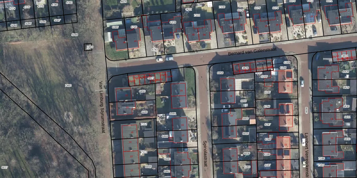 Spinolastraat 19 is gelegen op kadastraal perceel GLO00B6445. Deze kadastrale aanduiding is uniek en wordt gebruikt door het Kadaster om eigendomsrechten en andere zakelijke rechten vast te leggen. Het perceel maakt onderdeel uit van de kadastrale gemeente Groenlo.