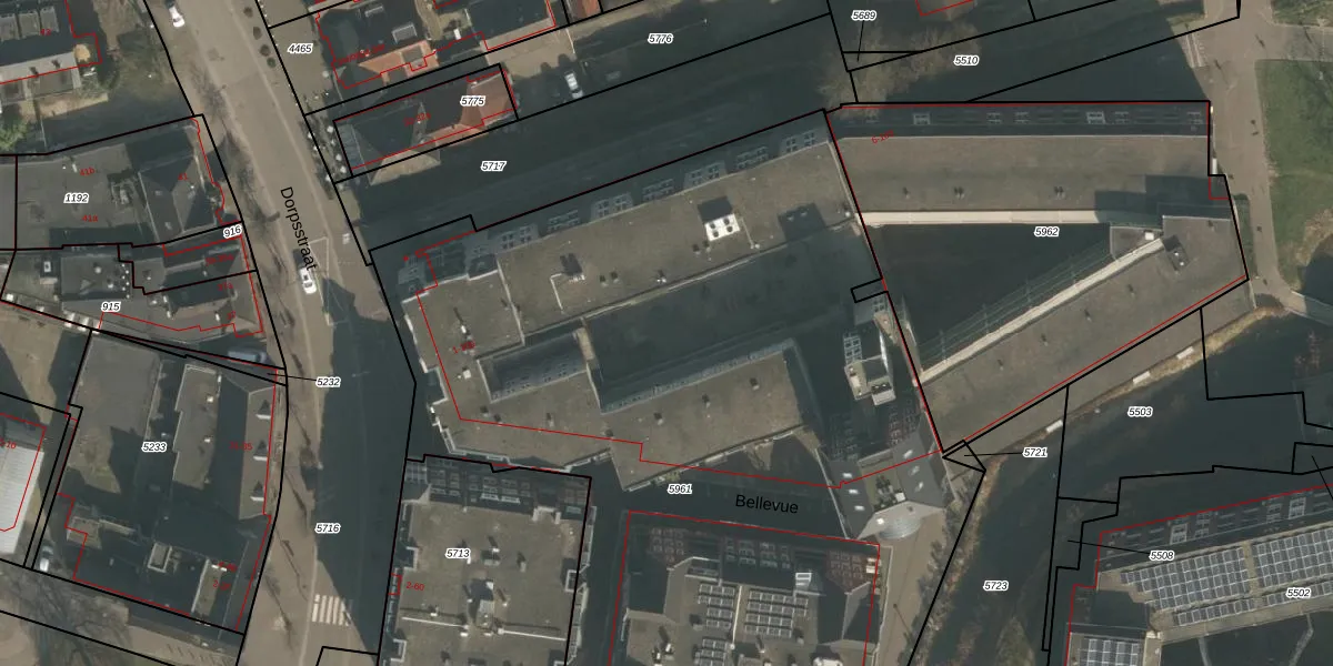 Het perceel waarop Bellevue 53 staat heeft een oppervlakte van 5303 m². Dit is een zeer groot perceel. De perceeloppervlakte wordt geregistreerd door het Kadaster. Gedetailleerde informatie over de maten van dit perceel kunt u vinden in het rapport Kadastrale kaart met maatvoering van Bellevue 53.