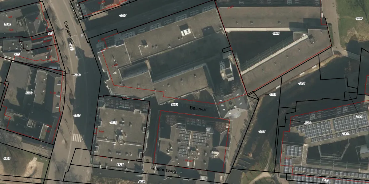 Het perceel waarop Bellevue 61 staat heeft een oppervlakte van 5303 m². Dit is een zeer groot perceel. De perceeloppervlakte wordt geregistreerd door het Kadaster. Gedetailleerde informatie over de maten van dit perceel kunt u vinden in het rapport Kadastrale kaart met maatvoering van Bellevue 61.