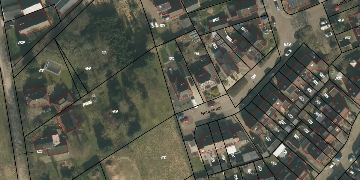 Beukstraat 14 is gelegen op kadastraal perceel GBK00M800. Deze kadastrale aanduiding is uniek en wordt gebruikt door het Kadaster om eigendomsrechten en andere zakelijke rechten vast te leggen. Het perceel maakt onderdeel uit van de kadastrale gemeente Groesbeek.