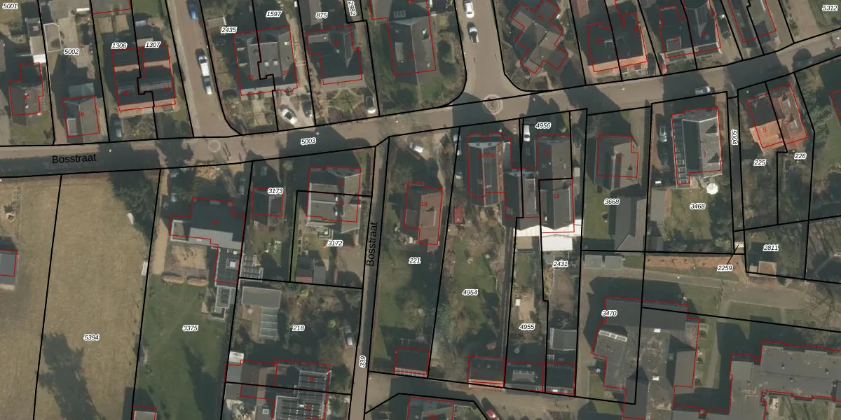 Het perceel waarop Bosstraat 19 staat heeft een oppervlakte van 880 m². Dit is een groot perceel. De perceeloppervlakte wordt geregistreerd door het Kadaster. Gedetailleerde informatie over de maten van dit perceel kunt u vinden in het rapport Kadastrale kaart met maatvoering van Bosstraat 19.