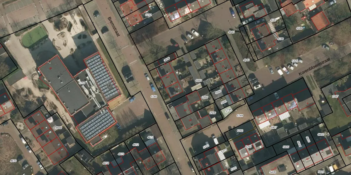 Het perceel waarop Bremstraat 54 staat heeft een oppervlakte van 1115 m². Dit is een zeer groot perceel. De perceeloppervlakte wordt geregistreerd door het Kadaster. Gedetailleerde informatie over de maten van dit perceel kunt u vinden in het rapport Kadastrale kaart met maatvoering van Bremstraat 54.