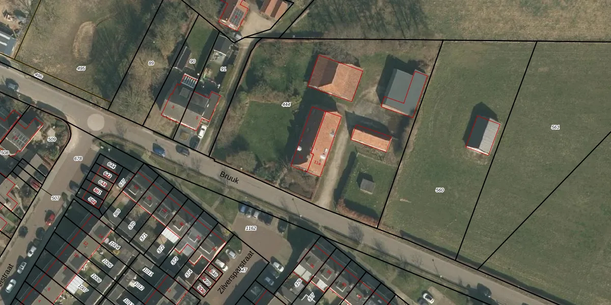Het perceel waarop Bruuk 11 staat heeft een oppervlakte van 3180 m². Dit is een zeer groot perceel. De perceeloppervlakte wordt geregistreerd door het Kadaster. Gedetailleerde informatie over de maten van dit perceel kunt u vinden in het rapport Kadastrale kaart met maatvoering van Bruuk 11.