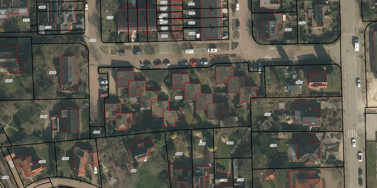 Het perceel waarop Chopinstraat 7-c staat heeft een oppervlakte van 2705 m². Dit is een zeer groot perceel. De perceeloppervlakte wordt geregistreerd door het Kadaster. Gedetailleerde informatie over de maten van dit perceel kunt u vinden in het rapport Kadastrale kaart met maatvoering van Chopinstraat 7-c.