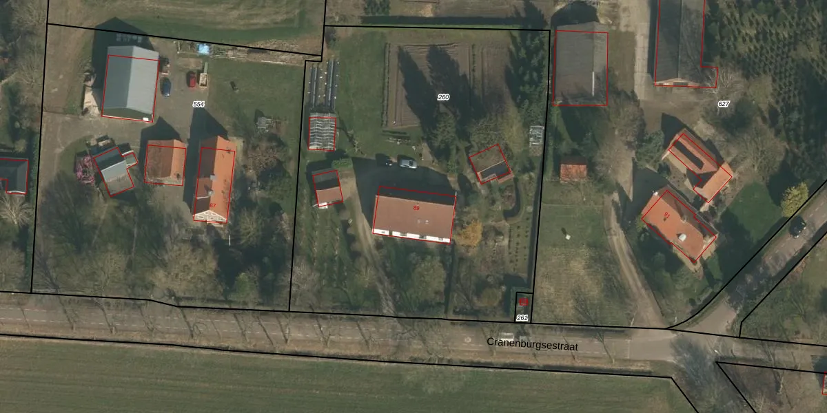Het perceel waarop Cranenburgsestraat 89 staat heeft een oppervlakte van 4075 m². Dit is een zeer groot perceel. De perceeloppervlakte wordt geregistreerd door het Kadaster. Gedetailleerde informatie over de maten van dit perceel kunt u vinden in het rapport Kadastrale kaart met maatvoering van Cranenburgsestraat 89.