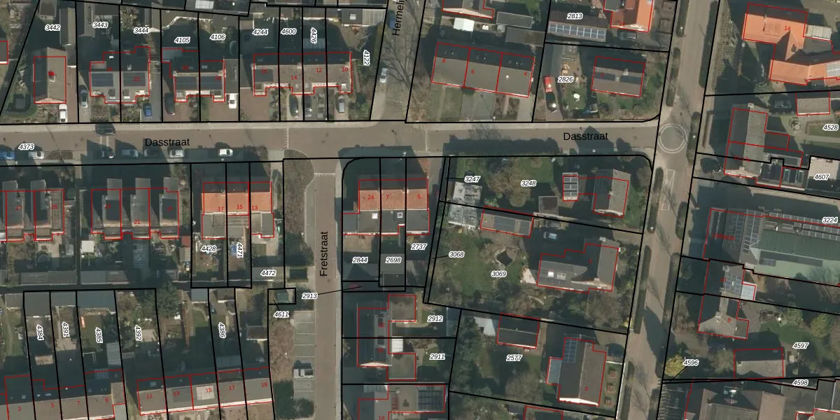Dasstraat 5 is gelegen op kadastraal perceel GBK00C2737. Deze kadastrale aanduiding is uniek en wordt gebruikt door het Kadaster om eigendomsrechten en andere zakelijke rechten vast te leggen. Het perceel maakt onderdeel uit van de kadastrale gemeente Groesbeek.