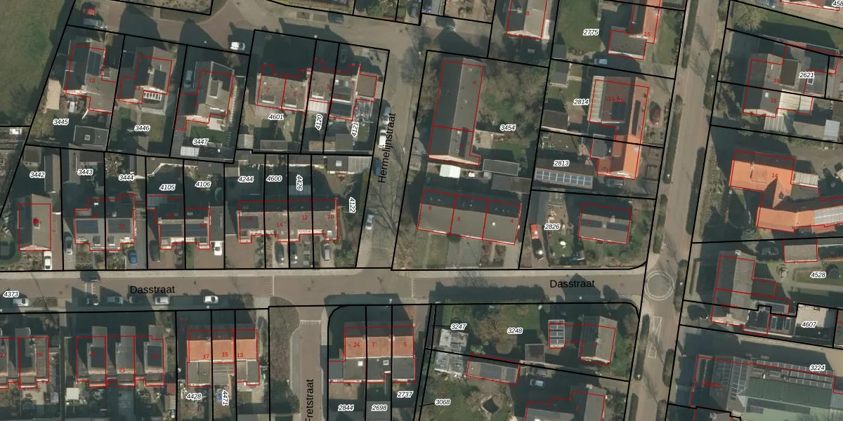 Dasstraat 8 is gelegen op kadastraal perceel GBK00C3454. Deze kadastrale aanduiding is uniek en wordt gebruikt door het Kadaster om eigendomsrechten en andere zakelijke rechten vast te leggen. Het perceel maakt onderdeel uit van de kadastrale gemeente Groesbeek.
