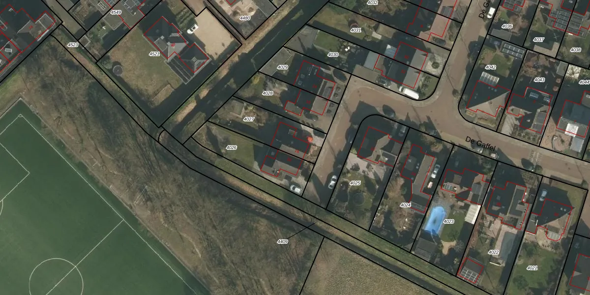 Het perceel waarop De Gaffel 18 staat heeft een oppervlakte van 409 m². Dit is een groot perceel. De perceeloppervlakte wordt geregistreerd door het Kadaster. Gedetailleerde informatie over de maten van dit perceel kunt u vinden in het rapport Kadastrale kaart met maatvoering van De Gaffel 18.