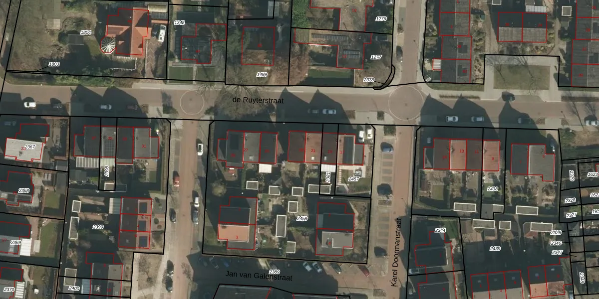 Het perceel waarop de Ruyterstraat 23 staat heeft een oppervlakte van 2096 m². Dit is een zeer groot perceel. De perceeloppervlakte wordt geregistreerd door het Kadaster. Gedetailleerde informatie over de maten van dit perceel kunt u vinden in het rapport Kadastrale kaart met maatvoering van de Ruyterstraat 23.