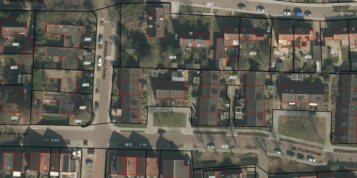 Het perceel waarop de Ruyterstraat 34 staat heeft een oppervlakte van 3990 m². Dit is een zeer groot perceel. De perceeloppervlakte wordt geregistreerd door het Kadaster. Gedetailleerde informatie over de maten van dit perceel kunt u vinden in het rapport Kadastrale kaart met maatvoering van de Ruyterstraat 34.