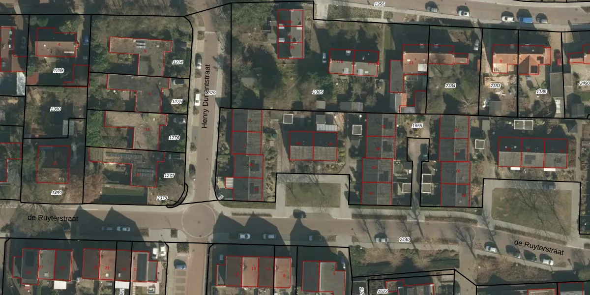 Het perceel waarop de Ruyterstraat 36 staat heeft een oppervlakte van 3990 m². Dit is een zeer groot perceel. De perceeloppervlakte wordt geregistreerd door het Kadaster. Gedetailleerde informatie over de maten van dit perceel kunt u vinden in het rapport Kadastrale kaart met maatvoering van de Ruyterstraat 36.