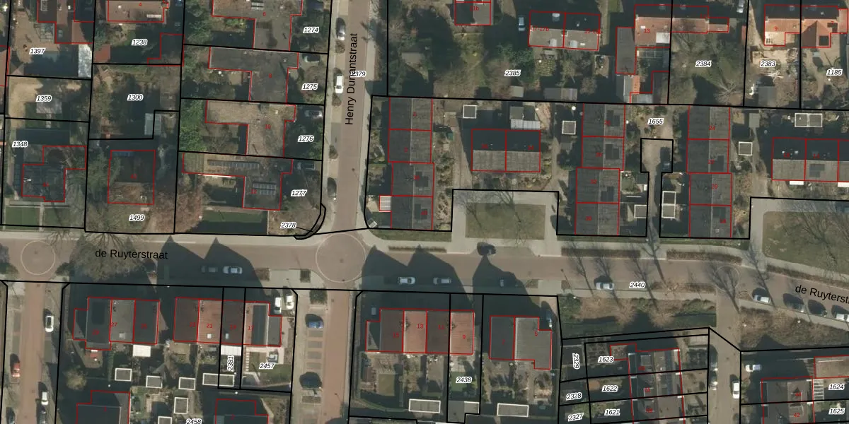 Het perceel waarop de Ruyterstraat 40 staat heeft een oppervlakte van 3990 m². Dit is een zeer groot perceel. De perceeloppervlakte wordt geregistreerd door het Kadaster. Gedetailleerde informatie over de maten van dit perceel kunt u vinden in het rapport Kadastrale kaart met maatvoering van de Ruyterstraat 40.