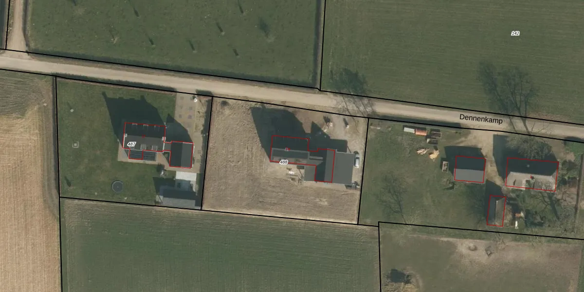 Het perceel waarop Dennenkamp 1-e staat heeft een oppervlakte van 2047 m². Dit is een zeer groot perceel. De perceeloppervlakte wordt geregistreerd door het Kadaster. Gedetailleerde informatie over de maten van dit perceel kunt u vinden in het rapport Kadastrale kaart met maatvoering van Dennenkamp 1-e.