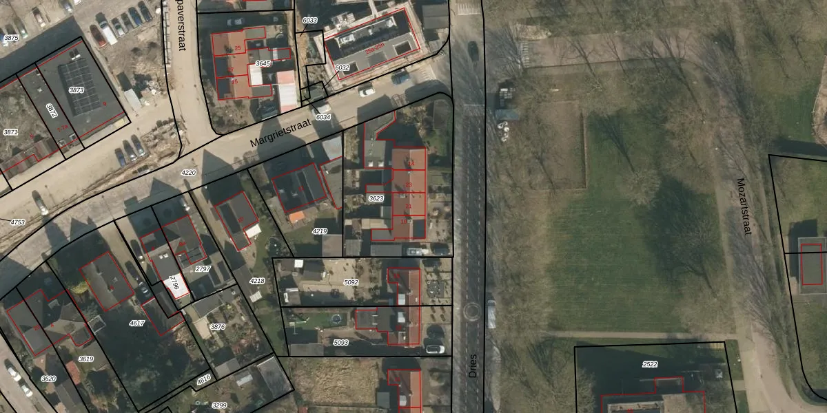 Dries 21 is gelegen op kadastraal perceel GBK00L3623. Deze kadastrale aanduiding is uniek en wordt gebruikt door het Kadaster om eigendomsrechten en andere zakelijke rechten vast te leggen. Het perceel maakt onderdeel uit van de kadastrale gemeente Groesbeek.