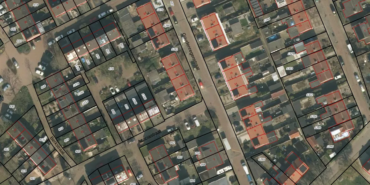 Goudenregenstraat 9 is gelegen op kadastraal perceel GBK00M1281. Deze kadastrale aanduiding is uniek en wordt gebruikt door het Kadaster om eigendomsrechten en andere zakelijke rechten vast te leggen. Het perceel maakt onderdeel uit van de kadastrale gemeente Groesbeek.