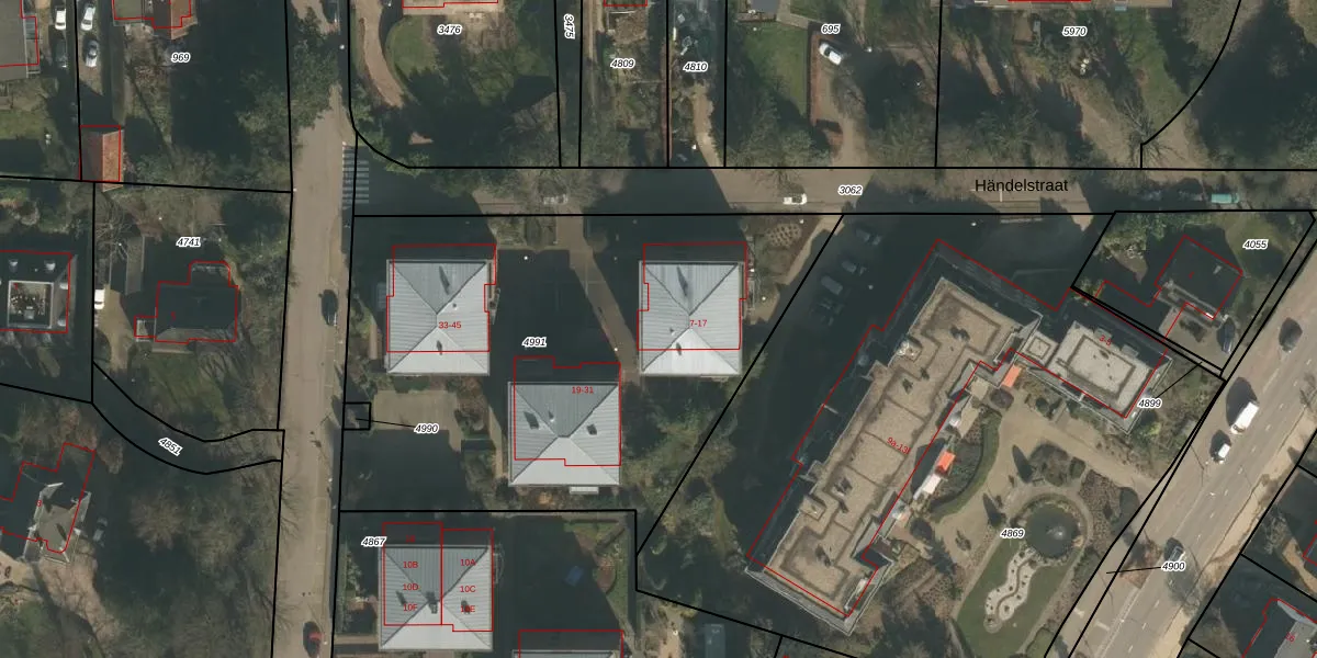 Händelstraat 17 is gelegen op kadastraal perceel GBK00L4991. Deze kadastrale aanduiding is uniek en wordt gebruikt door het Kadaster om eigendomsrechten en andere zakelijke rechten vast te leggen. Het perceel maakt onderdeel uit van de kadastrale gemeente Groesbeek.