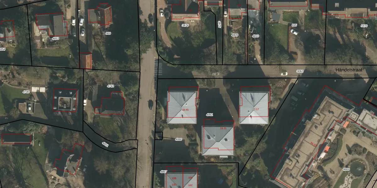 Händelstraat 35 is gelegen op kadastraal perceel GBK00L4991. Deze kadastrale aanduiding is uniek en wordt gebruikt door het Kadaster om eigendomsrechten en andere zakelijke rechten vast te leggen. Het perceel maakt onderdeel uit van de kadastrale gemeente Groesbeek.