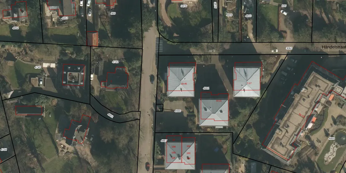 Händelstraat 45 is gelegen op kadastraal perceel GBK00L4991. Deze kadastrale aanduiding is uniek en wordt gebruikt door het Kadaster om eigendomsrechten en andere zakelijke rechten vast te leggen. Het perceel maakt onderdeel uit van de kadastrale gemeente Groesbeek.